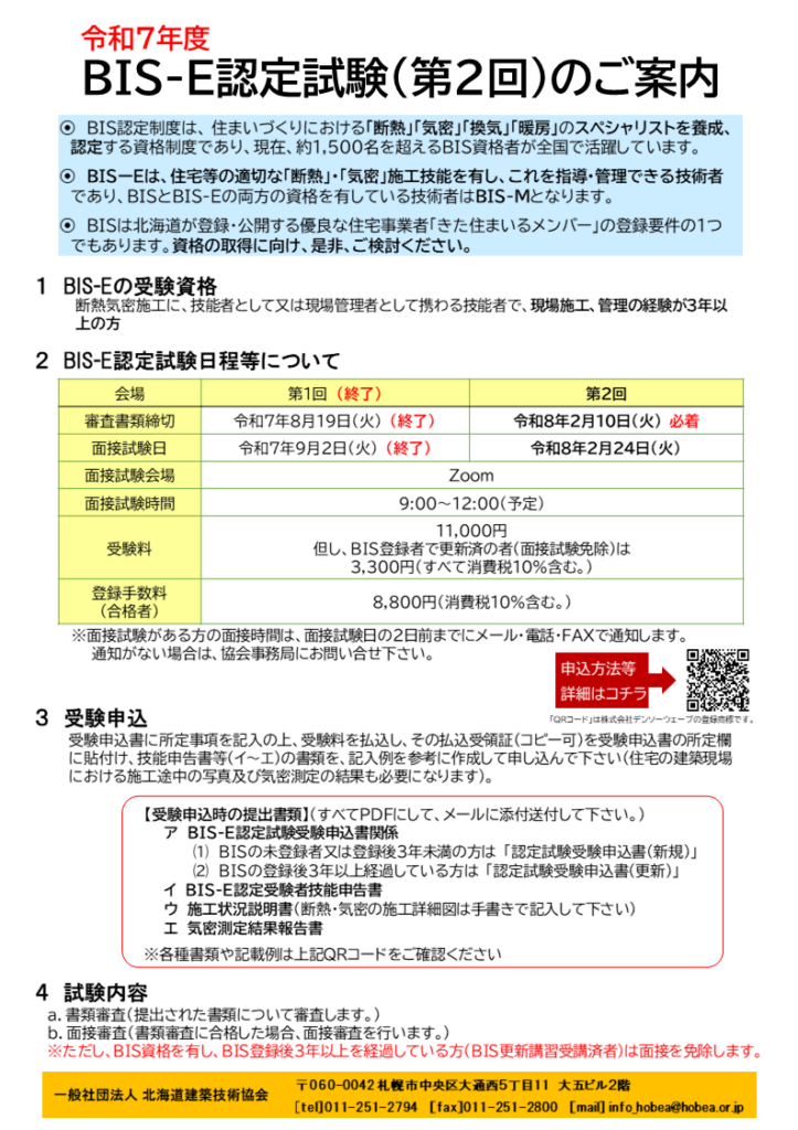 (一社)北海道建築技術協会では、令和7年度BIS-E認定試験(第2回)のお申込受付中です。