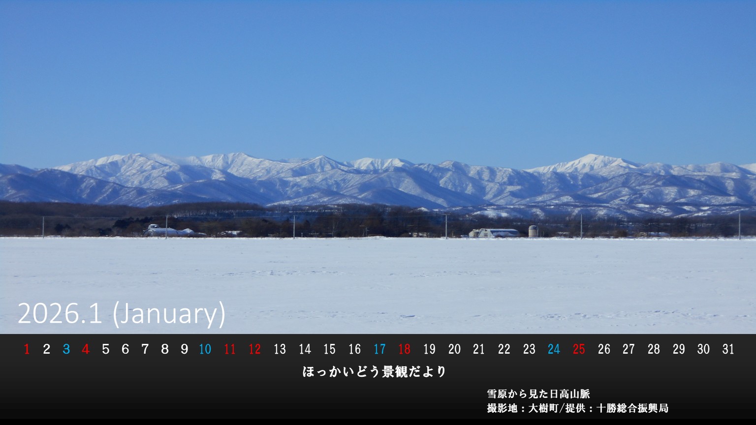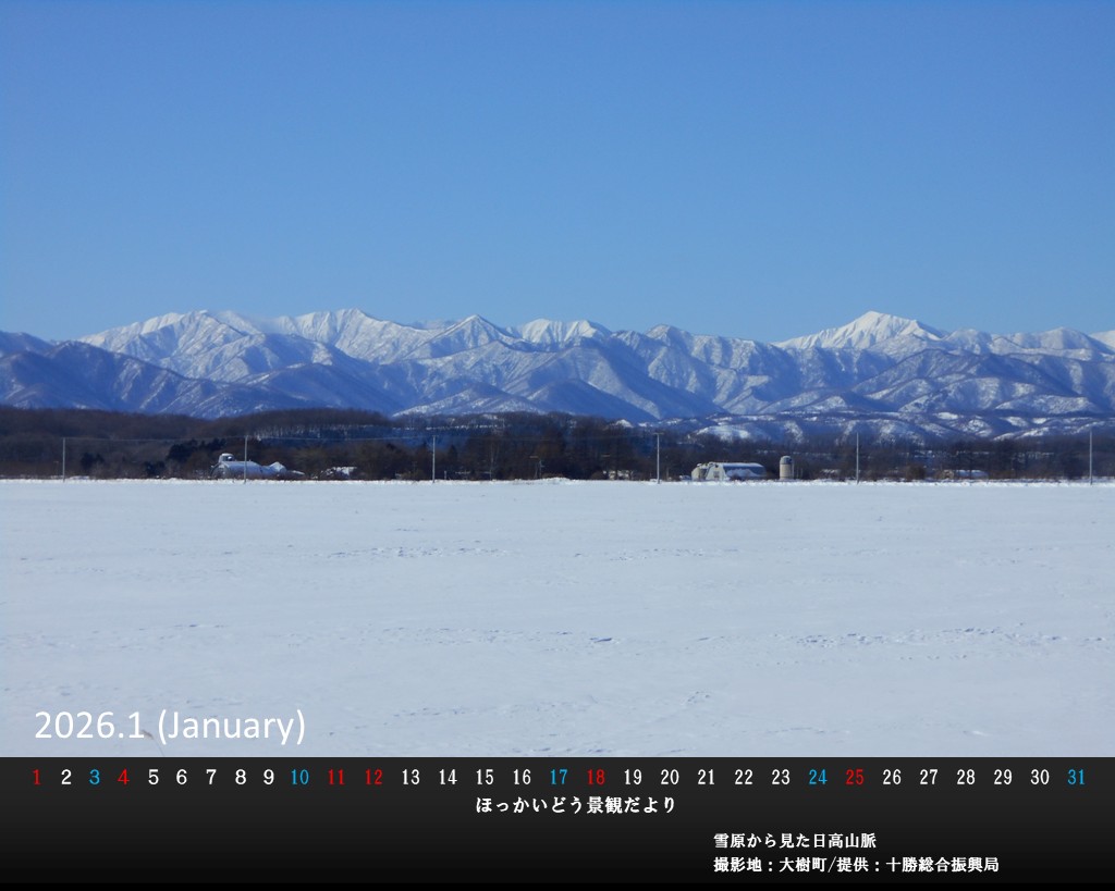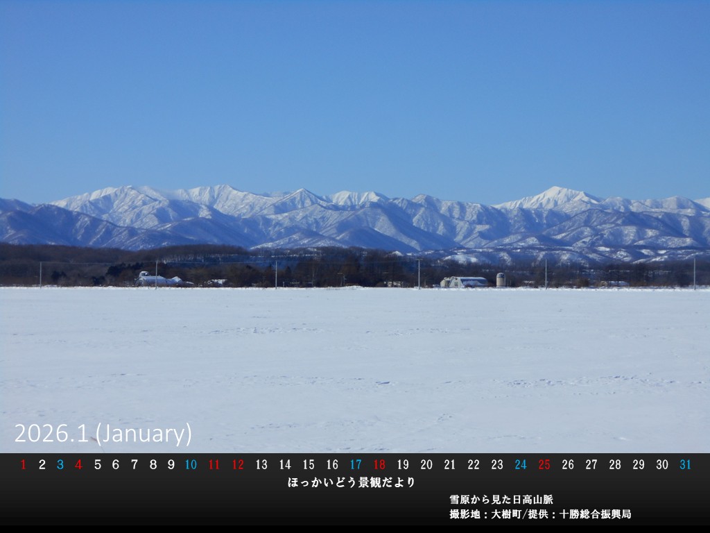 令和8年1月は、大樹町の「雪原から見た日高山脈」です。